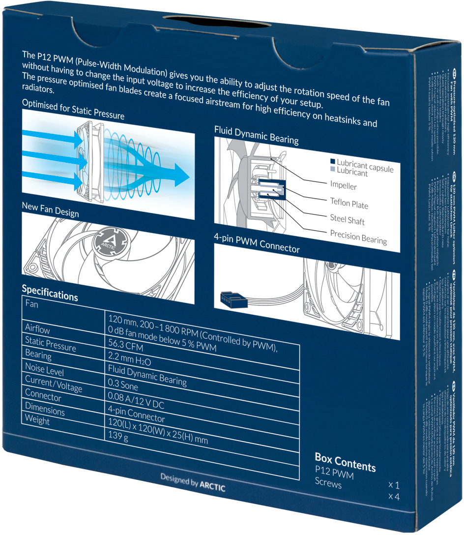 De ARCTIC P12 PWM is een krachtige en stille 120mm ventilator met PWM-ondersteuning voor automatische toerentalregeling tussen 200 en 1800 RPM. Hij biedt een luchtverplaatsing van 56 CFM en een statische druk van 2,20 mm/H2O, ideaal voor koellichamen en radiatoren. Dankzij het lage geluidsniveau van maximaal 24,5 dB en de duurzame Fluid Dynamic Bearing is dit een betrouwbare en veelzijdige oplossing voor efficiënte pc-koeling.