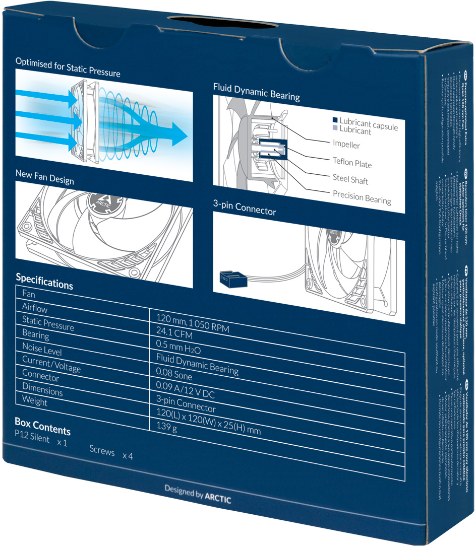 De ARCTIC P12 Silent is een stille 120mm ventilator, ideaal voor pc-behuizingen en koellichamen. Dankzij het lage toerental van 1050 RPM en een geluidsproductie van slechts 7,0 dB biedt deze fan fluisterstille werking. Met een luchtverplaatsing van 24 CFM en hoge statische druk is hij efficiënt, zelfs bij luchtweerstand. Uitgerust met een Fluid Dynamic Bearing en 3-pin aansluiting is dit een betrouwbare oplossing voor stille koeling.