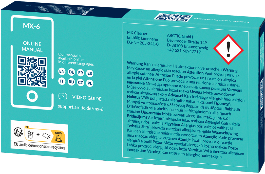 De Arctic MX-6 ULTIMATE Performance Thermal Paste is een hoogwaardige koelpasta ontworpen voor een efficiënte warmteoverdracht tussen de CPU en de koelplaat. Met een thermische geleidbaarheid van 7,5 W/m·K biedt deze pasta uitstekende koeling voor luchtkoelsystemen. De verpakking bevat ook 6 MX Cleaner doekjes, waarmee het oppervlak eenvoudig gereinigd kan worden voor een optimale toepassing. De pasta is ideaal voor langdurige, efficiënte koeling van je CPU, zelfs bij hoge temperaturen.