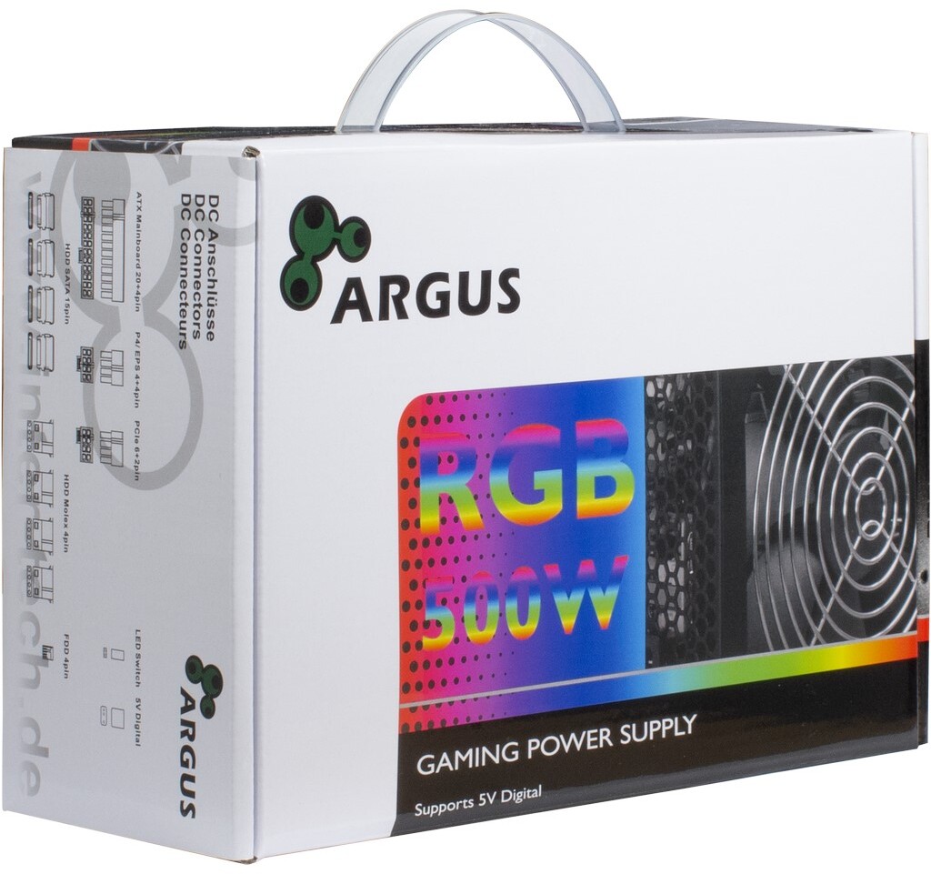 De ARGUS RGB-500 II Bronze is een 500W ATX-voeding met 80 PLUS Bronze-certificering en een efficiëntie tot 85%. Deze voeding beschikt over actieve PFC, een stille 14 cm ventilator (1935 dB) en vaste kabels, waaronder 4x SATA, 4x Molex en een 6+2-pins PCIe-connector. De RGB-verlichting is instelbaar via een knop of 3-pin 5V header. Ideaal voor wie een stabiele stroomvoorziening én visuele flair zoekt in een betaalbare PSU.