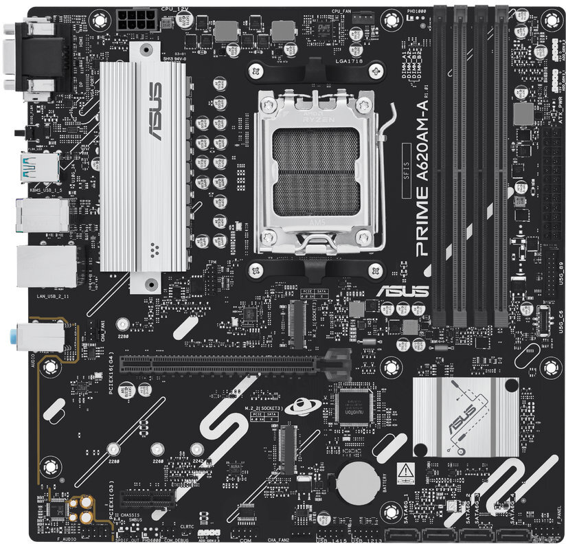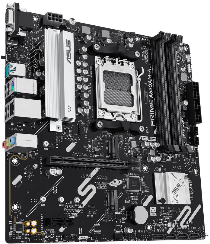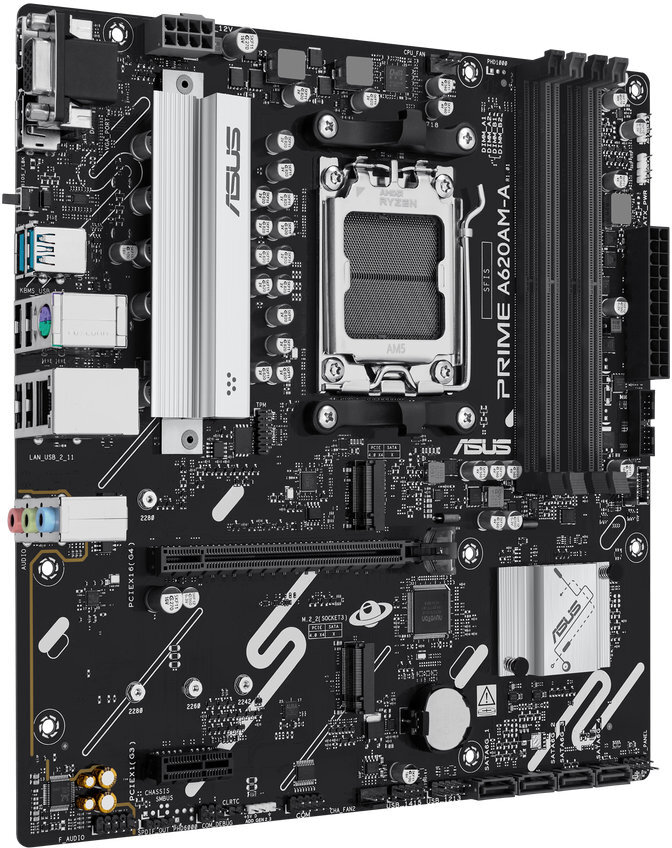Het ASUS PRIME A620AM-A-CSM moederbord is een micro-ATX bord voor AMD Ryzen 7000, 8000 en 9000 serie processors met AM5 socket. Het ondersteunt dual-channel DDR5-geheugen tot 256 GB en kloksnelheden tot 7600 MHz via overklok. Met 4 SATA III-poorten, twee M.2 slots en meerdere PCIe-sloten biedt het uitgebreide uitbreidingsmogelijkheden. Achteraan zijn HDMI, DisplayPort en VGA aanwezig, samen met USB 2.0 en 3.2 poorten en een 1 Gbit Ethernet-poort. De geïntegreerde 7.1-kanaals audio met Realtek-chip maakt dit bord geschikt voor kantoor- en thuisopstellingen.
