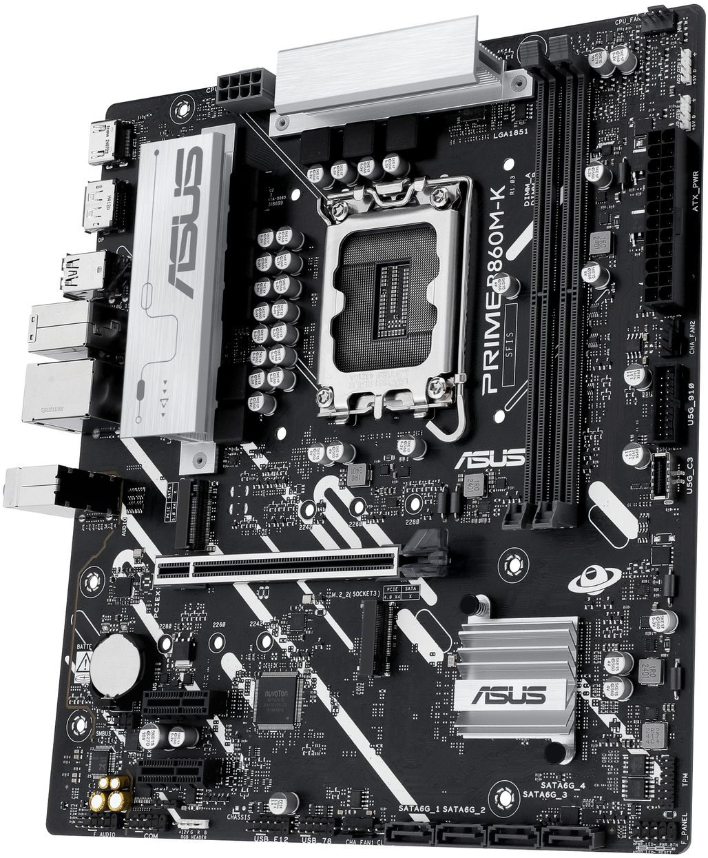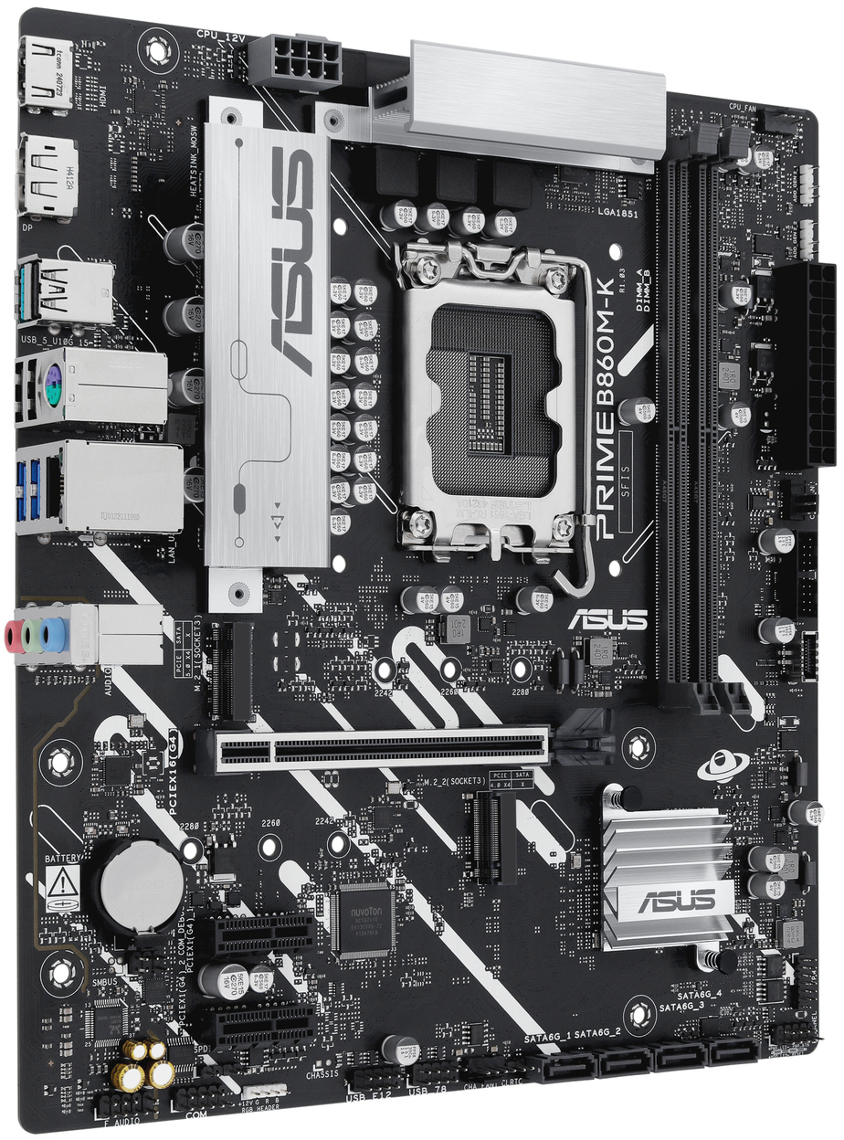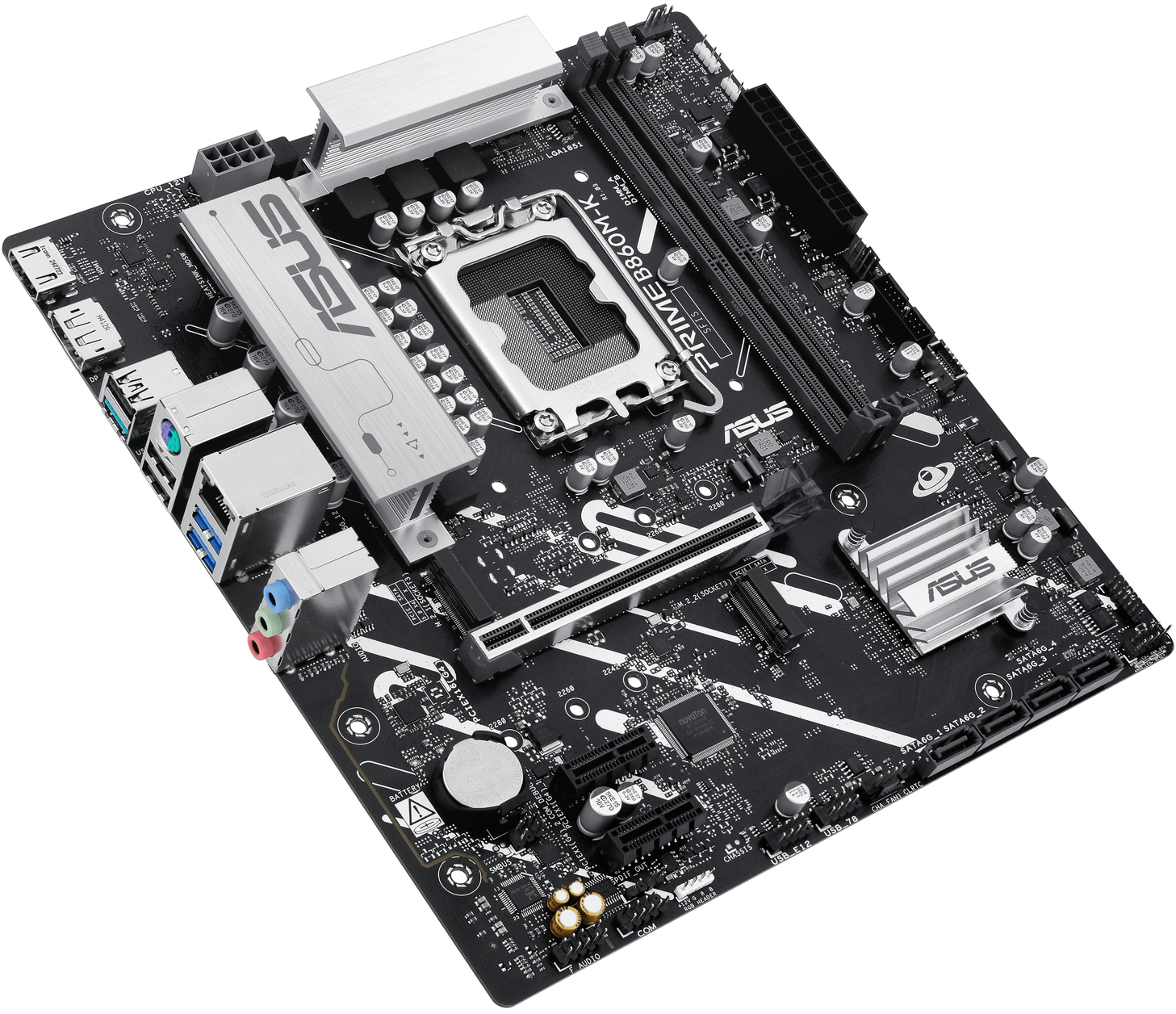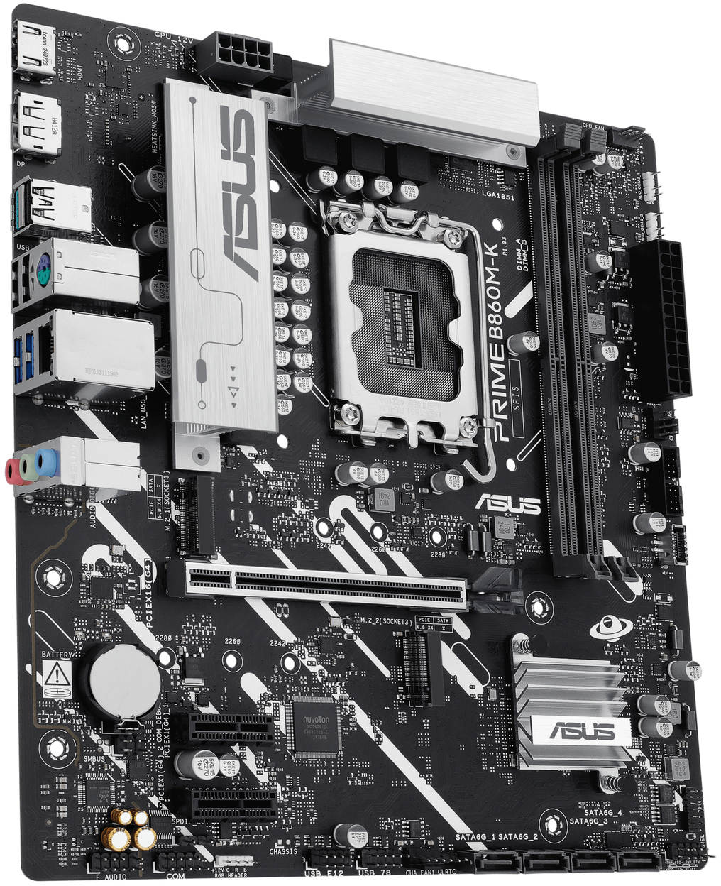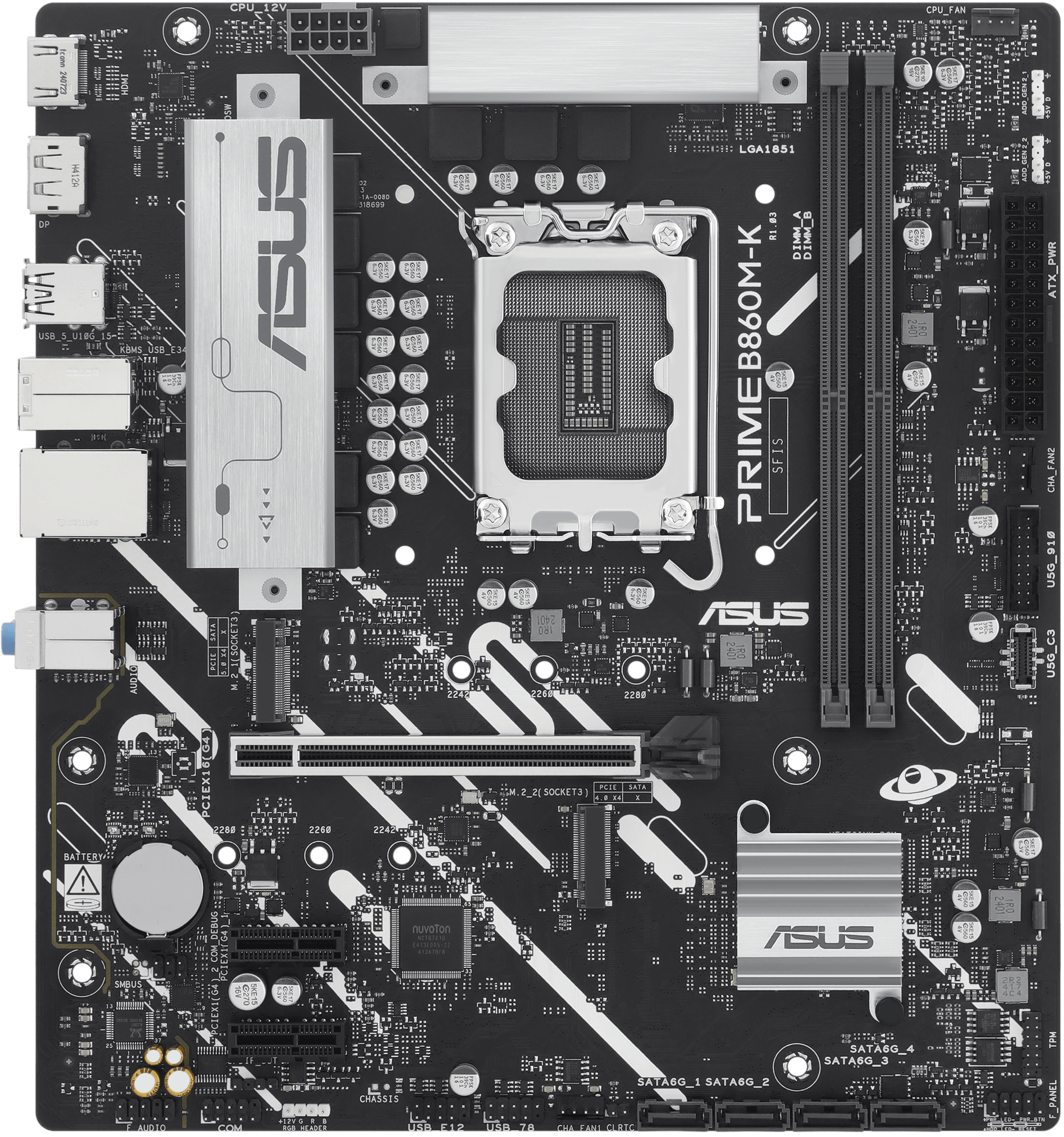 Het ASUS PRIME B860M-K is een compact micro-ATX moederbord met de Intel B860 chipset voor Intel Socket 1851 processoren. Het biedt twee geheugenslots en twee M.2 slots voor snelle SSD-opslag. Met zijn eenvoudige maar krachtige functionaliteit is dit moederbord een solide keuze voor opbouw van een compacte, maar krachtige desktop-PC.