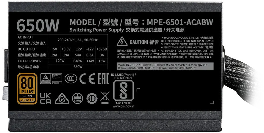 De COOLER MASTER MWE 650 BRONZE v3 is een hoogwaardige ATX-voeding van 650 W, ontworpen voor betrouwbare prestaties in moderne PC-systemen. Met een efficiëntie van 88% en actieve Power Factor Correctie (PFC) voldoet deze voeding aan de 80 PLUS Bronze-norm, wat zorgt voor energiebesparing en stabiele stroomtoevoer. De voeding beschikt over een 20+4 pin ATX-connector, vier 6+2 pin PCIe-aansluitingen, zes SATA- en drie Molex-connectoren, plus EPS-connectors voor extra CPU-voeding. De vaste bekabeling en compacte afmetingen (15 x 14 x 8,6 cm) maken installatie eenvoudig, terwijl de 12 cm ventilator zorgt voor stille, efficiënte koeling.