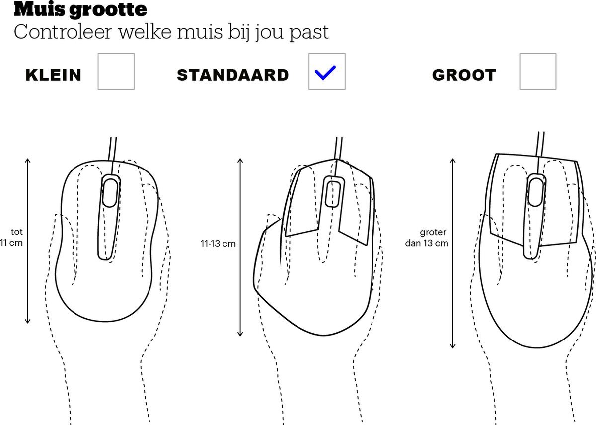 In principe zijn alle muizen te bedienen hoe groot/klein je handen ook zijn, toch is het voor een ergonomische houding belangrijk dat de muis past bij de handgrootte. Meet vanaf de pols tot het topje van de middelvinger en bepaal welk formaat het beste bij je past:
