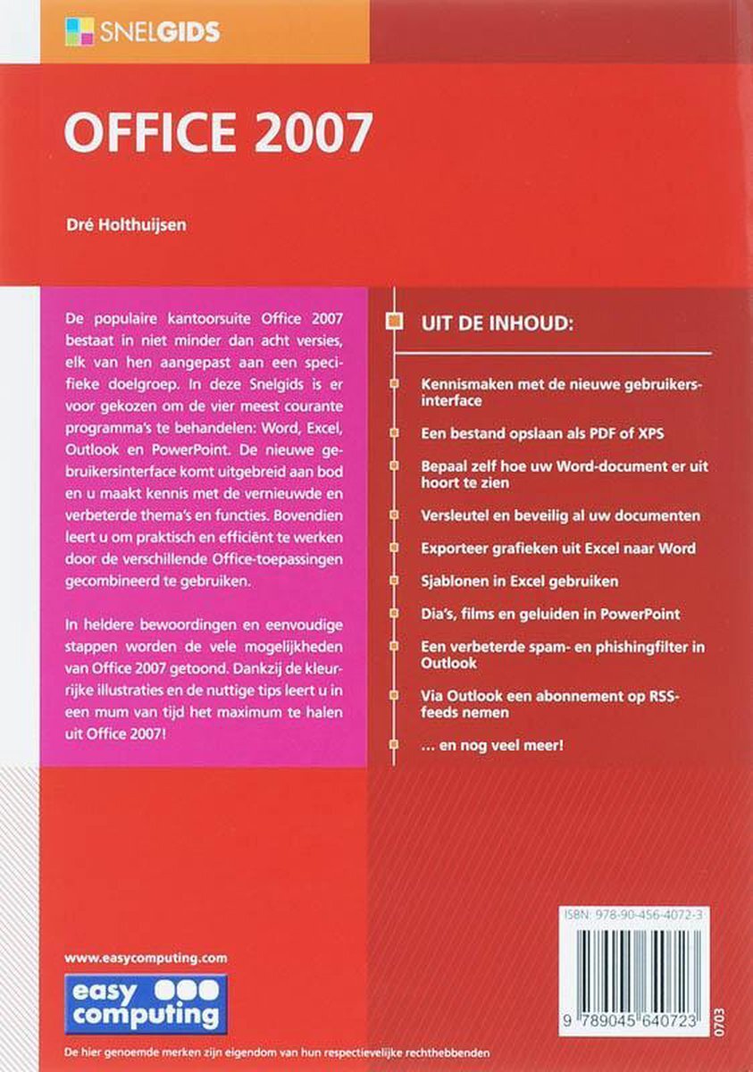De populaire kantoorsuite Office 2007 bestaat in niet minder dan acht versies, elk van hen aangepast aan een specifieke doelgroep. In deze Snelgids is er voor gekozen om de vier meest courante programma's te behandelen: Word, Excel, Outlook en PowerPoint. De nieuwe gebruikersinterface komt uitgebreid aan bod en u maakt kennis met de vernieuwde en verbeterde thema's en functies. Bovendien leert u om praktisch en effici te werken door de verschillende Office-toepassingen gecombineerd te gebruiken. In heldere bewoordingen en eenvoudige stappen worden de vele mogelijkheden van Office 2007 getoond. Dankzij de kleurrijke illustraties en de nuttige tips leert u in een mum van tijd het maximum te halen uit Office 2007!