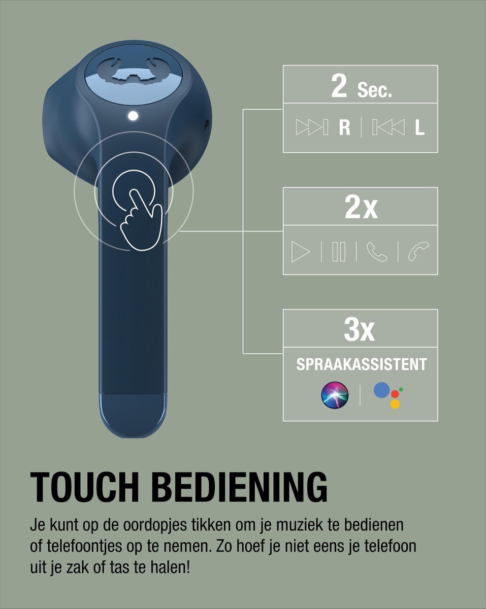 Je kunt op de oordopjes tikken om je muziek te bedienen of telefoontjes op te nemen. Zo hoef je niet eens je telefoon uit je zak of tas te halen!