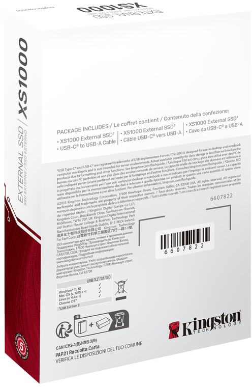 De Kingston XS1000 is een compacte en razendsnelle externe SSD met een opslagcapaciteit van 1 TB. Dankzij de USB 3.2 Gen 2 Type-C aansluiting biedt deze schijf leessnelheden tot 1050 MB/s en schrijfsnelheden tot 1000 MB/s. De stevige behuizing van metaal en kunststof zorgt voor duurzaamheid en draagbaarheid, ideaal voor onderweg. Compatibel met Windows, macOS, Linux en mobiele besturingssystemen zoals Android en iOS. De XS1000 combineert hoge prestaties met gebruiksgemak en is perfect voor het snel overzetten en veilig opslaan van grote bestanden.