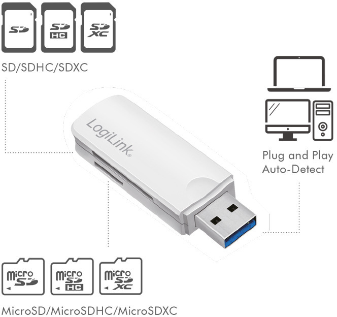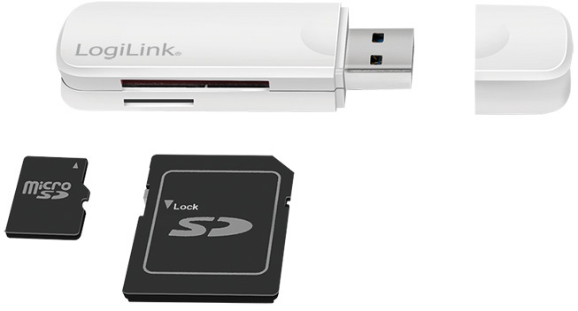 Compacte USB 3.0-kaartlezer voor het lezen en schrijven van SD/SDHC, microSD/SDHC, evenals SDXC-kaarten en microSDXC. Hij wordt aangesloten op de USB 3.0-poort en is achterwaarts compatibel met USB 2.0 en USB 1.1.