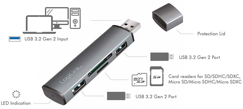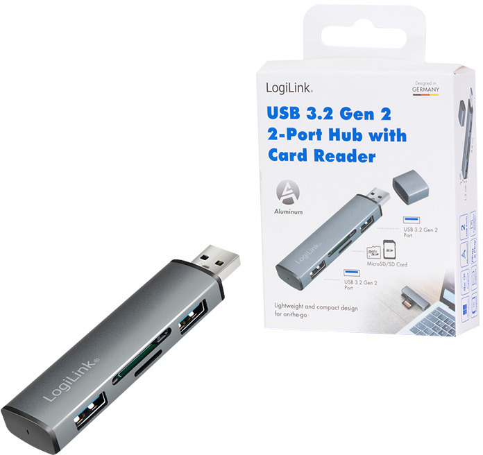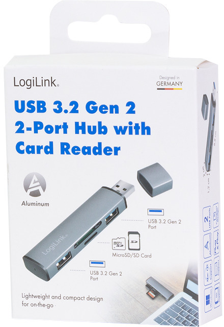 De hub ondersteunt de moderne USB 3.2 Gen2-standaard en biedt de mogelijkheid om maximaal 2 USB-apparaten, 1x Micro SD-kaart en 1x SD-kaart aan te sluiten. Uiteraard kunt u ook apparaten van oudere USB-generaties aansluiten en gebruiken. Deze praktische en nobel ogende hub met zijn aluminium design is een echte blikvanger op elk bureau. Eenvoudige aansluiting via plug & play. USB 3.2-overdrachtssnelheden tot 10 Gbit/s.