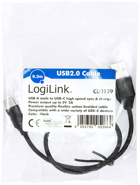De LogiLink CU0139 is een korte en stevige USB 2.0-kabel van 0,3 meter met een USB-A naar USB-C aansluiting. Ideaal voor het opladen en synchroniseren van compatibele apparaten via een standaard USB-A poort, zoals laptops, laders of powerbanks. Ondersteunt tot 5V/3A (15W) laadvermogen. Dankzij het compacte formaat en de duurzame metalen behuizing is deze kabel perfect voor mobiel gebruik of op werkplekken met beperkte ruimte.