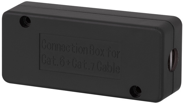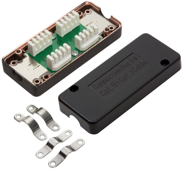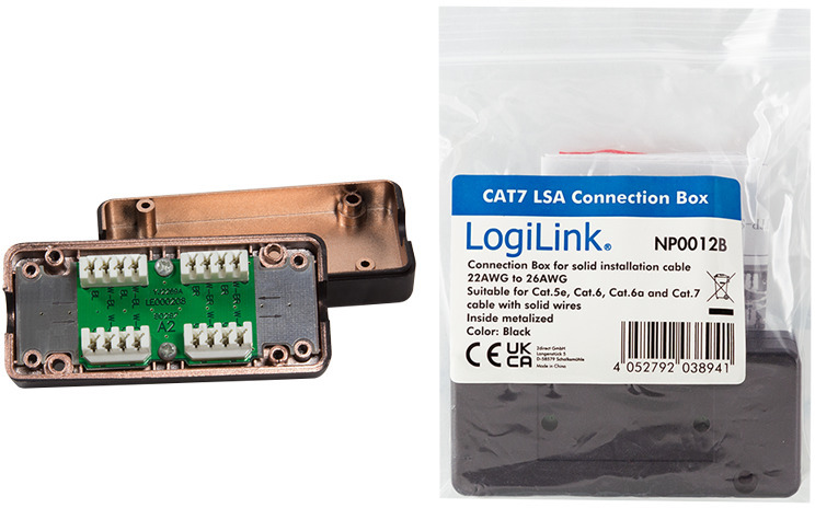 De LogiLink NP0012B is een zwart kabelverbindingsdoos die twee Ethernet-kabels zonder netwerkstekker met elkaar verbindt. Het product is geschikt voor kabelcategorieën 5e, 6, 6A en 7, en maakt gebruik van kleurgecodeerde IDC-aansluitingen voor eenvoudige installatie volgens de A- en B-standaarden. Het biedt een betrouwbare oplossing voor snelle reparaties in gestructureerde bekabeling. De afmetingen van het koppelstuk zijn 83 x 38 x 25 mm en de behuizing is afgeschermd voor extra bescherming.