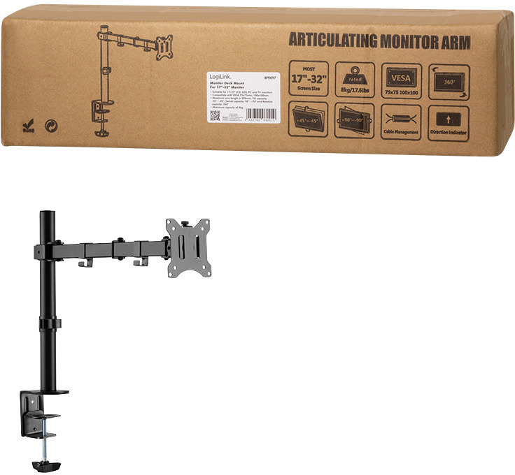 De LogiLink BP0097 monitorarm biedt een flexibele oplossing voor het ophangen van schermen van 17" tot 32" met een maximaal gewicht van 8 kg. De VESA-compatibiliteit (75x75 mm en 100x100 mm) zorgt voor veelzijdige montageopties. De zwarte afwerking past in elke kantoor- of thuiskantooromgeving. De arm is in hoogte verstelbaar en uitschuifbaar tot 390 mm, waardoor je de ideale kijkhoek kunt instellen. De arm is kantelbaar, draaibaar en eenvoudig te installeren.