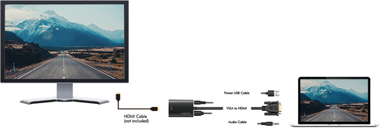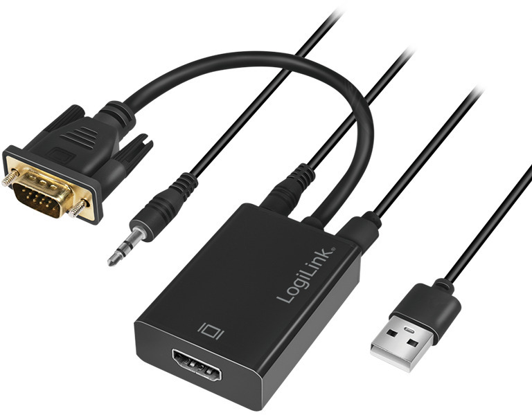 De VGA naar HDMI-adapter van LogiLink is ideaal voor het aansluiten van VGA-apparaten op HDMI-apparaten. Het zet de analoge signalen van het VGA-apparaat en audiosignalen om in digitale HDMI-signalen, bijvoorbeeld voor flatscreentelevisies, AV-ontvangers of projectoren.