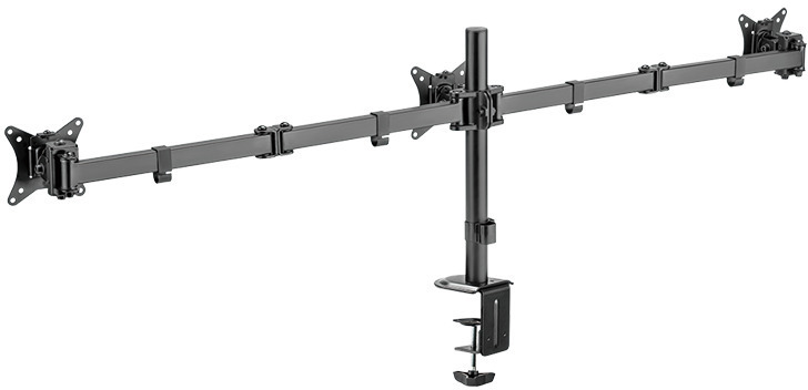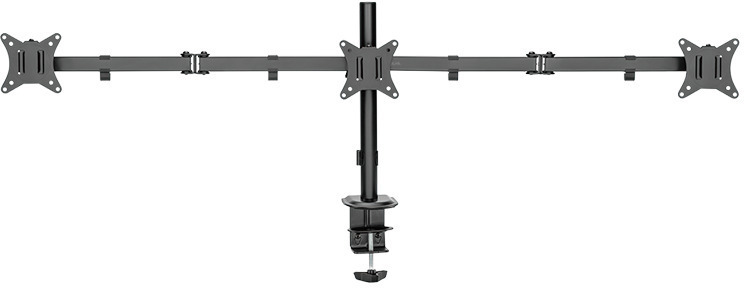 De LogiLink BP0173 is een robuuste bureaubeugel voor drie monitoren van 17" tot 27". Met een gewichtscapaciteit van 7 kg per arm en VESA-montage, biedt deze flexibele steun verstelbare hoeken, rotatie en kabelbeheer voor een georganiseerde werkplek. Ideaal voor multitasking met drie schermen, verhoogt de productiviteit en vermindert rommel. De montage is eenvoudig met een tafelklemmontage of doorvoermontage, en het zwart design past in elk kantoor.