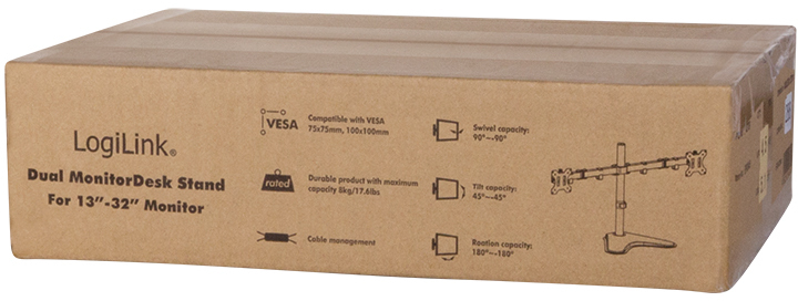 De LogiLink BP0045 32' Dual Monitor Desk Stand biedt een robuuste en flexibele oplossing voor het ophangen van twee monitoren tot 32 inch groot en 8 kg per scherm. Met ondersteuning voor VESA-montages van 100x100 en 75x75 mm is het geschikt voor een breed scala aan beeldschermen. De standaard is verkrijgbaar in zwart en grijs, waardoor deze gemakkelijk in uw werkruimte past.