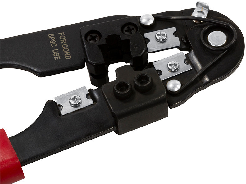De tool waarmee u in 4 handelingen uw eigen netwerk- en telefoonkabels op de gewenste lengte kunt maken. Knip de kabel met de kniptang op de juiste maat, verwijder met een stripper de kunststof coating netjes, steek de kabeldraden in de gewenste connectoren, steek de connector met kabel in de houder van de krimptang en druk één keer stevig aan. De mesbeschermer zorgt voor veilig werken en de kunststof handgrepen zorgen voor een goede grip.