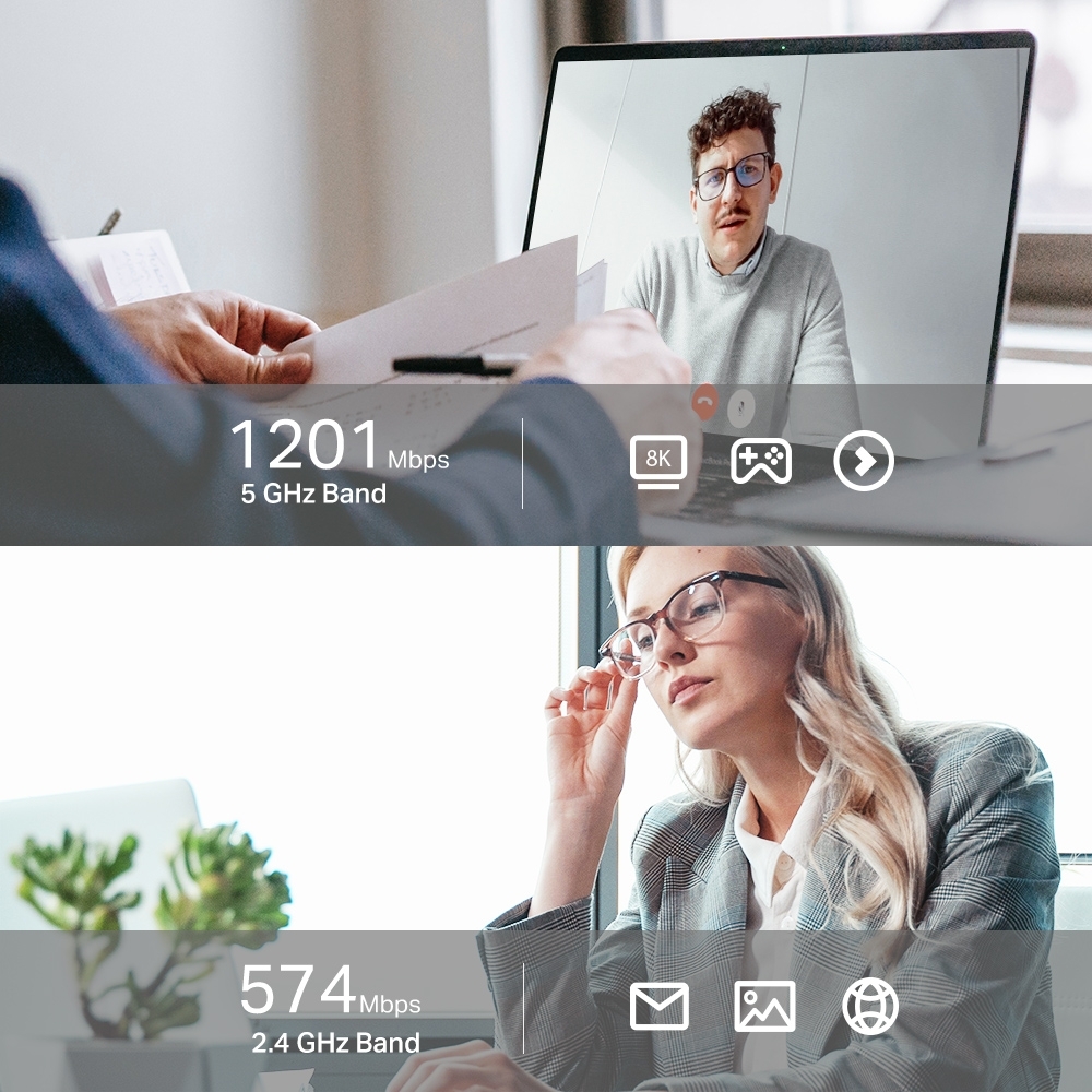 Snelle wifi 6 doorbreek de gigabit-barrière met snelheden tot 1201 Mbps (5 GHz) + 574 Mbps (2.4 GHz)