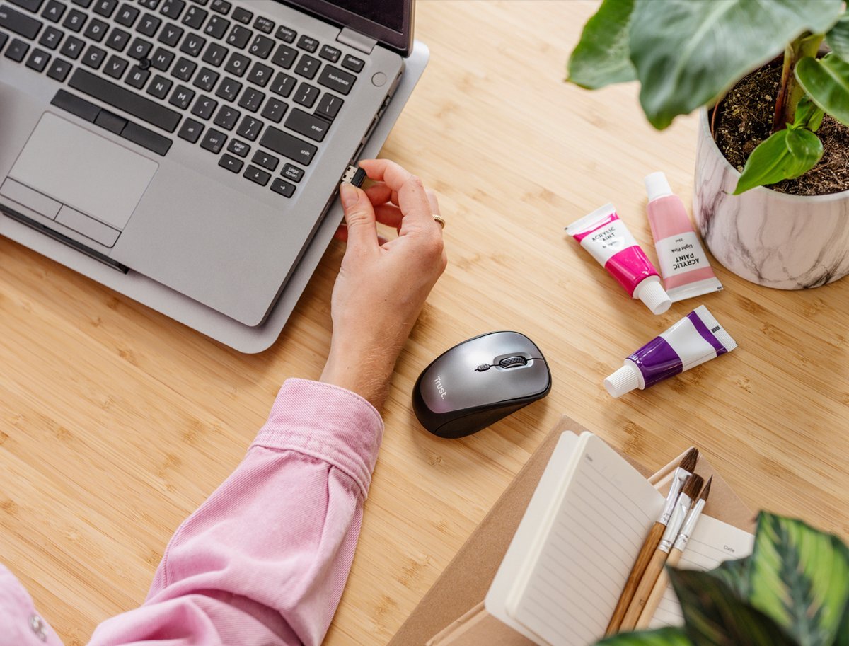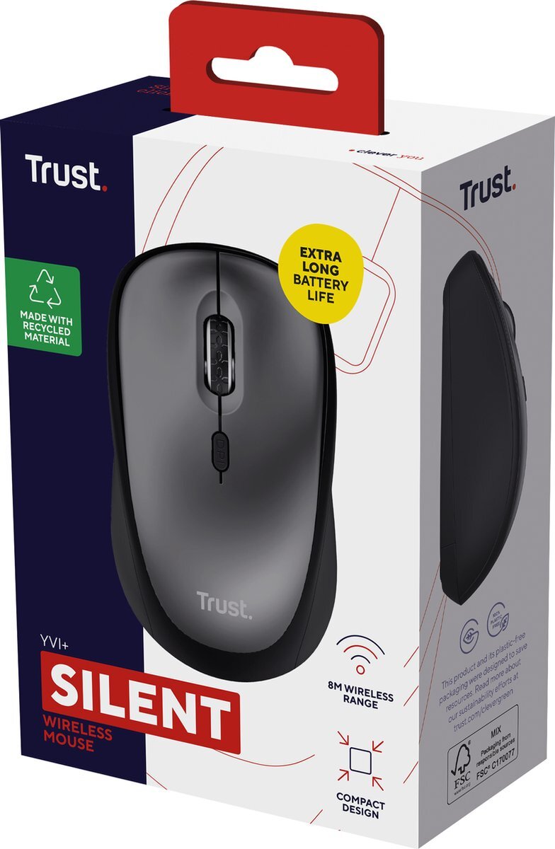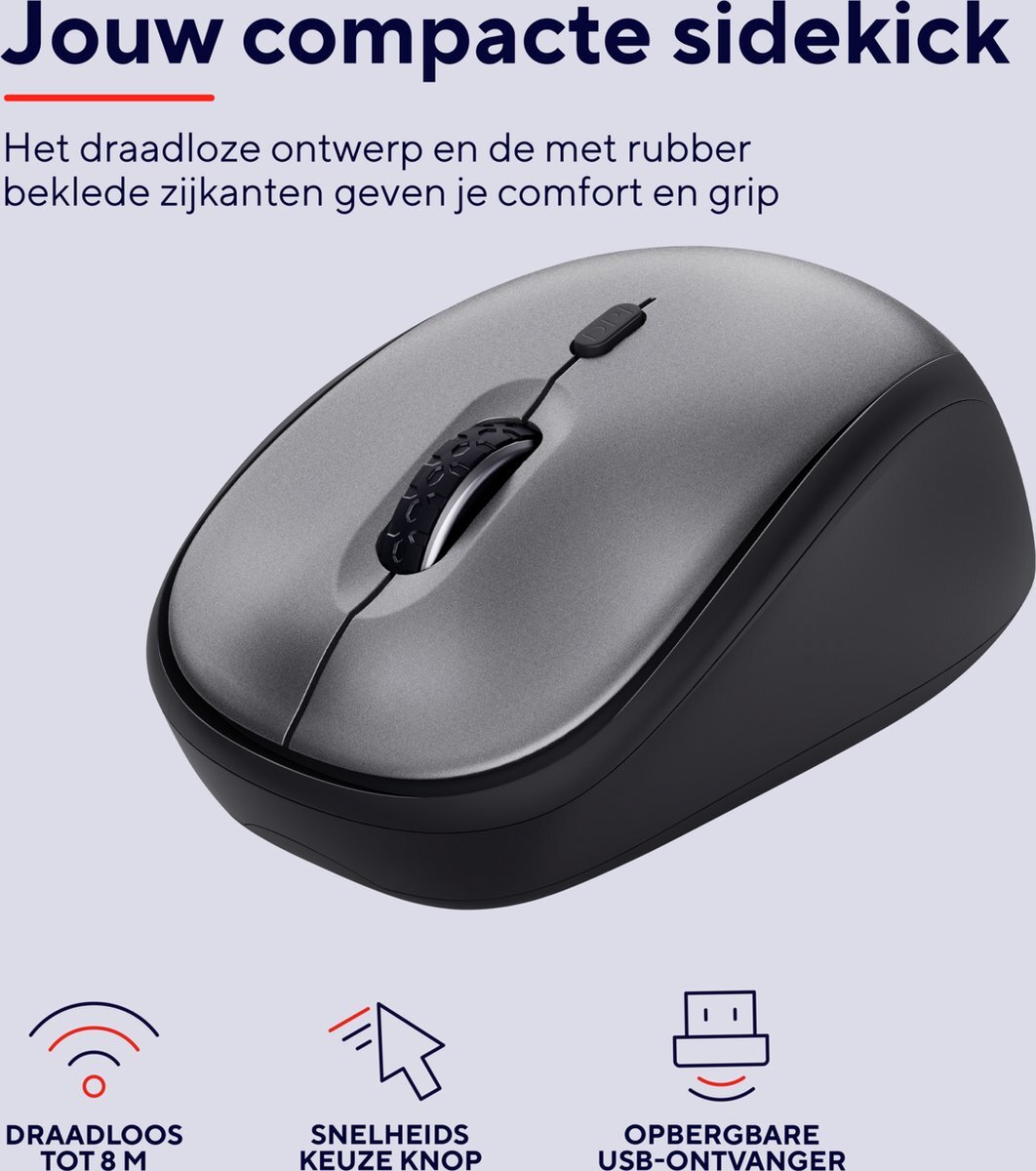 De Trust Yvi+ is een compacte, draadloze muis met stille knoppen, ideaal voor rustig werken. Gemaakt van 83% gerecycled materiaal, combineert hij duurzaamheid met comfort dankzij rubberen zijkanten. Met een instelbare DPI (800/1600), aan-uitschakelaar en opbergbare USB-receiver is deze muis zowel praktisch als energiezuinig. Geschikt voor links- en rechtshandigen, met tot 12 maanden batterijduur.